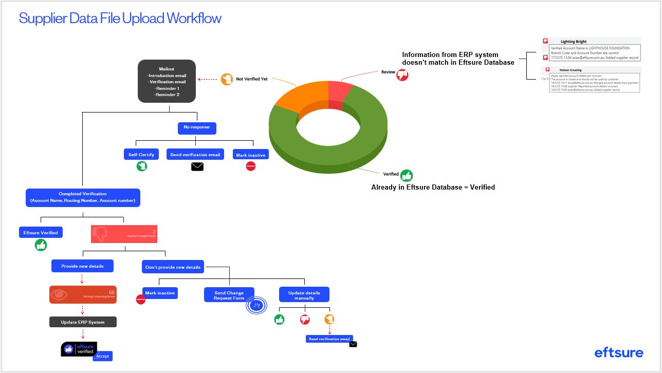 When a Supplier Data File is uploaded into Eftsure, the Suppliers will be identified as Verified (Green thumb), Not Verified yet or Unverified (No TIN / Employee) (Orange thumb) and Review (Red thumb), here is the workflow for the Supplier's verification statuses.